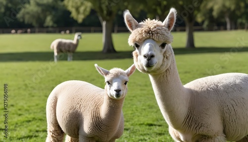 Fototapeta premium Alpaca Mother and Baby in a Green Pasture