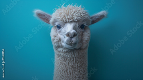 Obraz premium Alpaca Portrait: A charming white alpaca with captivating blue eyes stares...