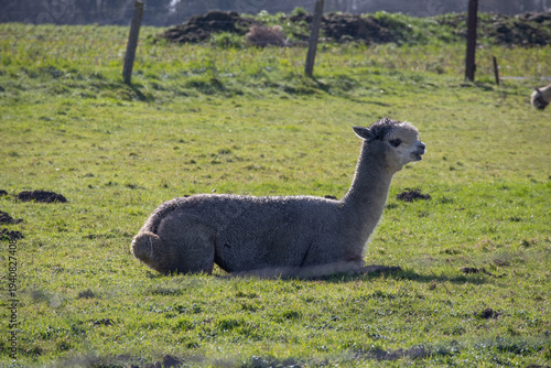 © Florian Dussart, Naklejka premium Alpaca resting in a green grassy field on a sunny day