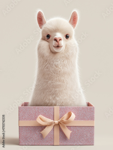 Obraz premium Alpaca sits in a pink gift box. Perfect for festive gifting.
