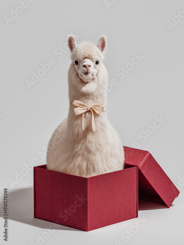 Naklejka premium Alpaca sits in a red gift box. A beige bow around its neck adds a playful...