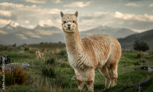 Fototapeta premium Alpaca Standing on Grassland with Mountain Landscape Behind