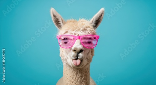 © Tetiana, Obraz premium Alpaca Wearing Pink Sunglasses Makes Funny Face