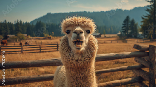 Obraz premium Alpaca with fluffy fur stands at a wooden fence in a sunlit pasture. Golden...