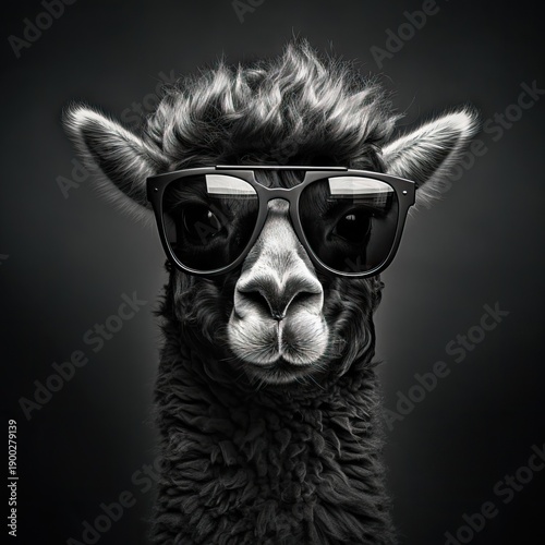 Fototapeta premium Alpaca with sunglasses on dark background creating a cool and humorous...