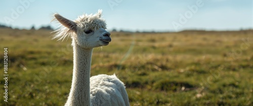 © AkuAku, Fototapeta premium Alpaca with white fur on green grass, looking into the distance