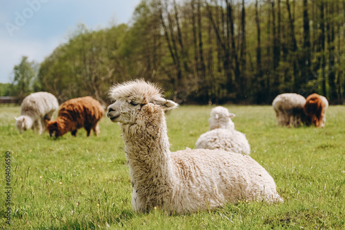 © sergo321, Fototapeta premium Alpacas graze in the spring meadow high in the mountains.