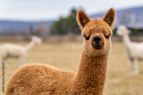 © Wasim, Obraz premium Alpacas in a field on a farm in Oregon