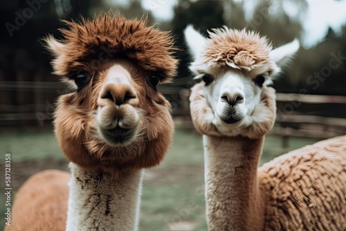 © AkuAku, Obraz premium Alpacas up up and personal. Generative AI