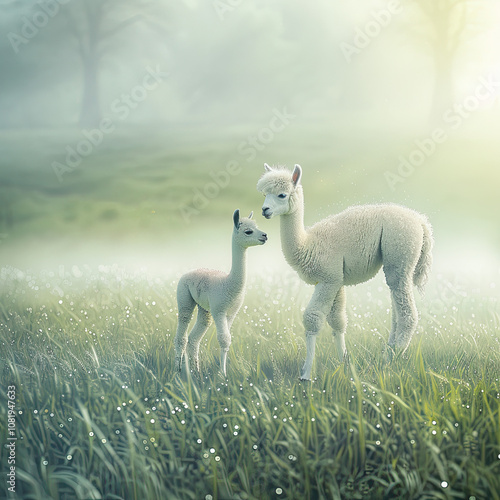 © DriftlessRamblings, Fototapeta premium Alpacas with Cria in Misty Field at Dawn – Wildlife Scene