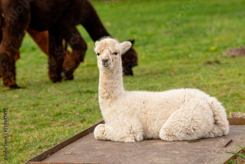 Fototapeta premium Alpakas braun, weiß schwarz auf der Weide