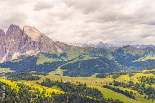 Fototapeta premium Alpe di Siusi, Seiser Alm with Sassolungo Langkofel Dolomite, a large green...