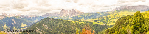 © SkandaRamana, Fototapeta premium Alpe di Siusi, Seiser Alm with Sassolungo Langkofel Dolomite, a large mountain in the background