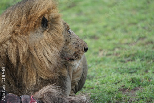 © Soaps, Naklejka premium alpha male lion of a pride in the seerengeti national park. Alpha lion eating a wildebeest gnu carcass