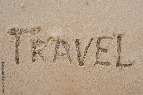© vxnaghiyev, Fototapeta premium Alphabet of the word 'travel' etched in golden sand on a sunny beach