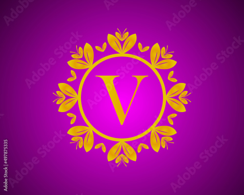 © Suhaeb, Fototapeta premium Alphabet V luxury logo design with gold color gradation and gold leaf circle suitable for bathing, hotel, beauty and grooming. against a violet VelVet background.