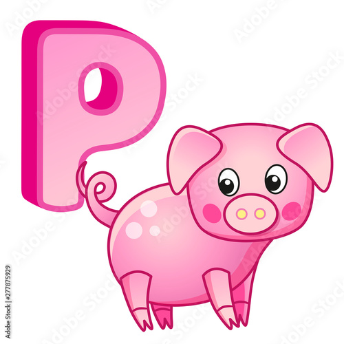 © Nataliia, Naklejka premium alphabet with capital letters of the English alphabet and cute cartoon illustrations. Poster for kindergarten and preschool. Cards for learning English. Letter P. Pig