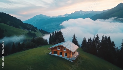 © Emqan, Fototapeta premium Alpine Cabin in Swiss Mountains with Cloudy Peaks