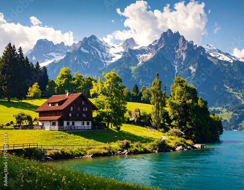 © shopia, Fototapeta premium Alpine chalet by a serene lake under a vibrant sky