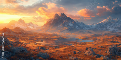© deounix, Fototapeta premium Alpine Dreams: Mountains in Golden Light