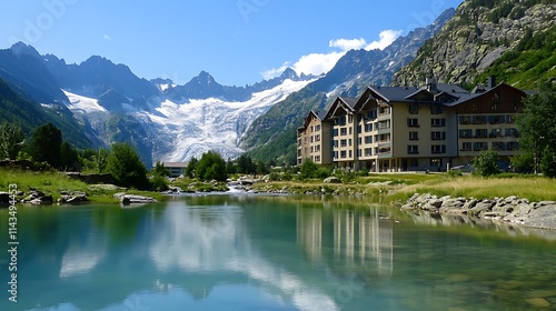 © heinng, Fototapeta premium Alpine Hotel Reflecting in Pristine Lake, French Alps Summer. AI Generated