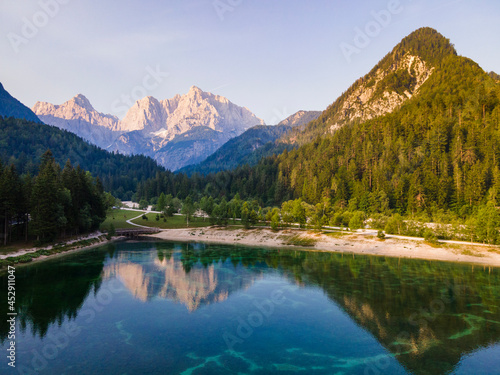Fototapeta premium Alpine lake Jasna in Slovenia. Drone View at Sunrise