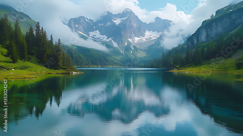Fototapeta premium Alpine lake reflection, misty mountains, scenic summer vista, travel poster