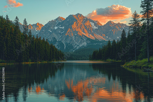 Fototapeta premium Alpine lake reflects sunset mountain peaks and forest