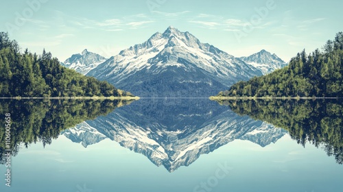 © Patcharaphorn, Naklejka premium Alpine lake with reflections of snow-capped mountains, surrounded by lush trees, clear blue sky, calm water, perfect symmetry, celebrating pure natural beauty