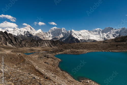 Naklejka premium Alpine lakes, Mounts Lhotse, Makalu, Baruntse and Chukchung Glacier from...