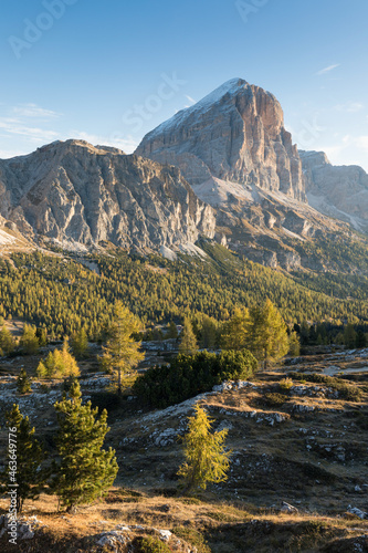 Fototapeta premium Alpine landscape, Mountains, fir trees and above all larches that change color assuming the typical yellow autumn color. Southern Tyrol. Amazing view from Passo Falzarego in Dolomites near Cortina.