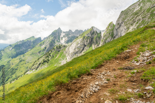 © Dirk, Fototapeta premium Alpine meadow and hiking trail in the foreground, Alpstein mountains with sharp rock peaks in the background. Beautiful hiking destination in the Swiss Alps. Wonderful travel destination. copy space.