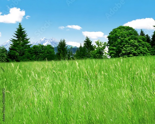 © Dimas, Obraz premium Alpine meadow landscape with mountain backdrop