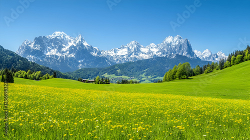 © Lailatul, Fototapeta premium Alpine meadow springtime wildflowers, snow-capped mountains background; idyllic landscape postcard