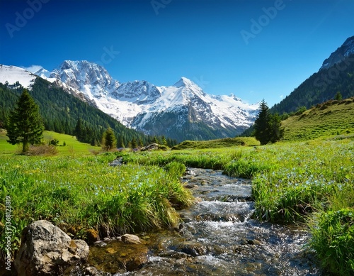 Obraz premium alpine meadow stream and majestic snow capped mountains