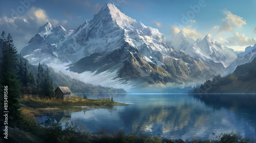 Fototapeta premium "Alpine Morning: Reflections of Snowy Peaks"