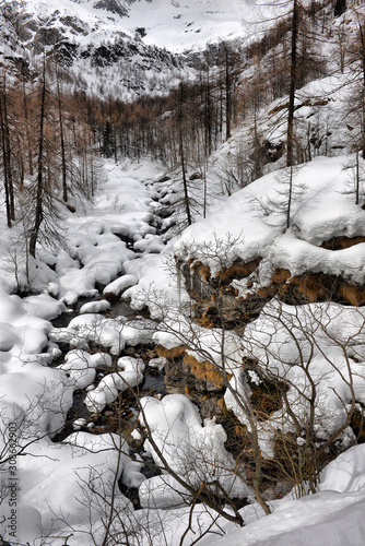 Fototapeta premium Alpine mountain river in winter on a cloudy day