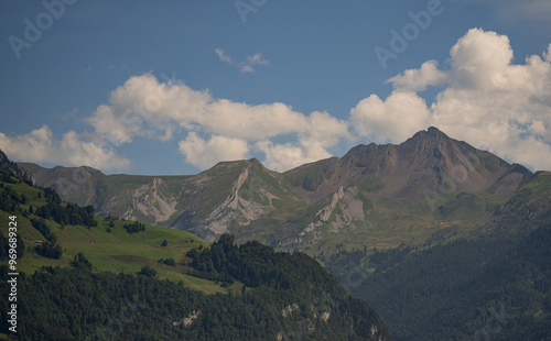 © Volodymyr, Fototapeta premium Alpine mountains and like in Switzerland. Alps mountains in Switzerland. Forest in the Swiss Alps. Panoramic of the nature of Switzerland. Nature of Swiss lakes. Switzerland scenic landscape.