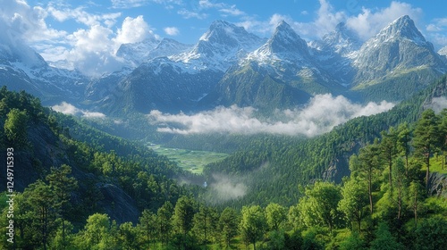 Obraz premium Alpine valley panorama, snow-capped peaks, lush forests, morning mist