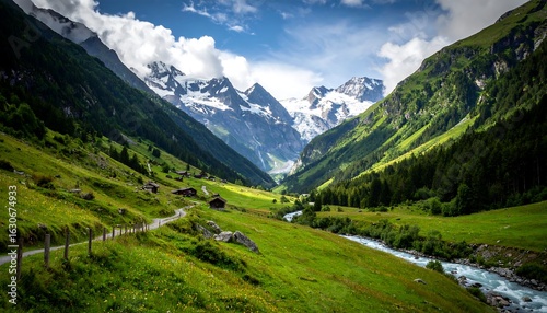 © Seputih, Obraz premium Alpine valley with snow-capped peaks