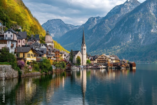 © kyla, Fototapeta premium Alpine village by a lake, colorful houses, dramatic mountains
