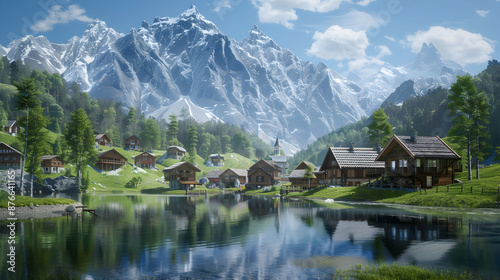 Naklejka premium Alpine village nestled in a lush valley with wooden chalets and a crystal-clear mountain lake reflecting snow-capped peaks