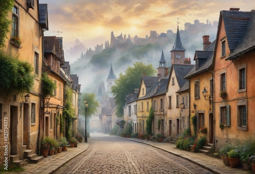 © MillionPixel$, Naklejka premium Alpine Village Scene with Stone Buildings and Cobblestone Road