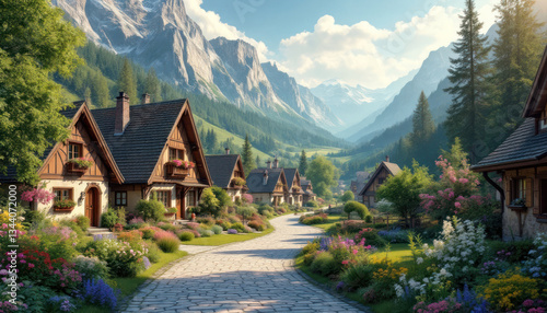 © adiba sakila atmari, Fototapeta premium Alpine Village: Serene Mountain Houses and Flowers
