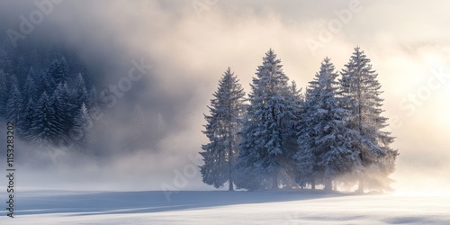 © Mehemmed, Fototapeta premium Alpine Winter Landscape Trees Blanketed in Snow with a Misty Fog Enveloping the Scene