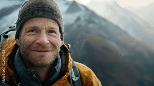 © ACG Studio, Naklejka premium Alpinista con la montaña de fondo posando a cámara sonriente.