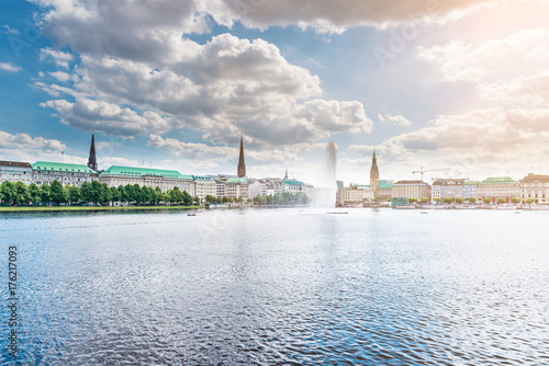 Naklejka premium Alster Lake Binnenalster panorama in Hamburg, Germany under beautiful sky
