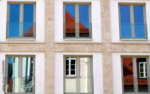 © christiane65, Obraz premium Altbau in Freiburg spiegelt sich in einer Neubaufassade