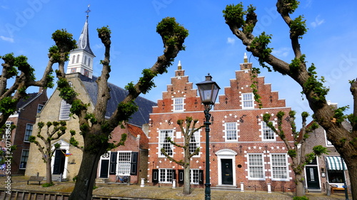 © globetrotter1, Fototapeta premium alte Häuser und Kirche in Sloten malerisch umrahmt von frisch aussprießenden Bäumen