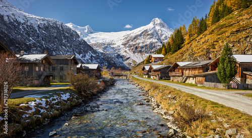 Fototapeta premium alte Holzhäuser, Großvenediger Gruppe, Innergschlöß, Osttirol, Tirol, Österreich